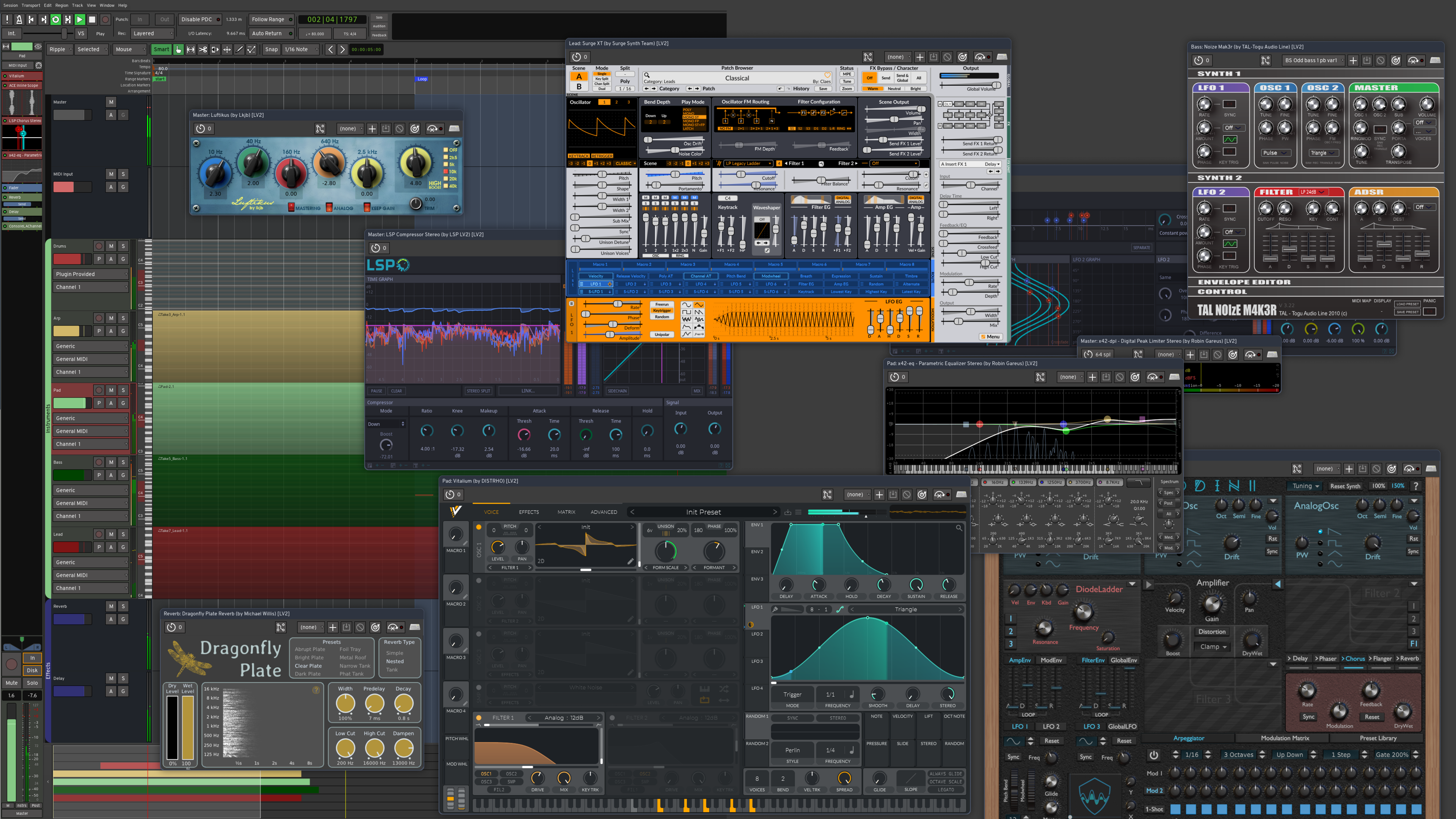 (<)(>)1/3 Bitwig Studio and a bunch of native Linux plugins running on Arch Linux GNOME (by Amadeus Paulussen).2/3 Ardour with a bunch of native (mostly FOSS) Linux plugins running on NixOS SwayFX (by Vivien).3/3 Ardour with a bunch of native FOSS Linux plugins running on LibraZiK MATE (by Nicolas Faure).